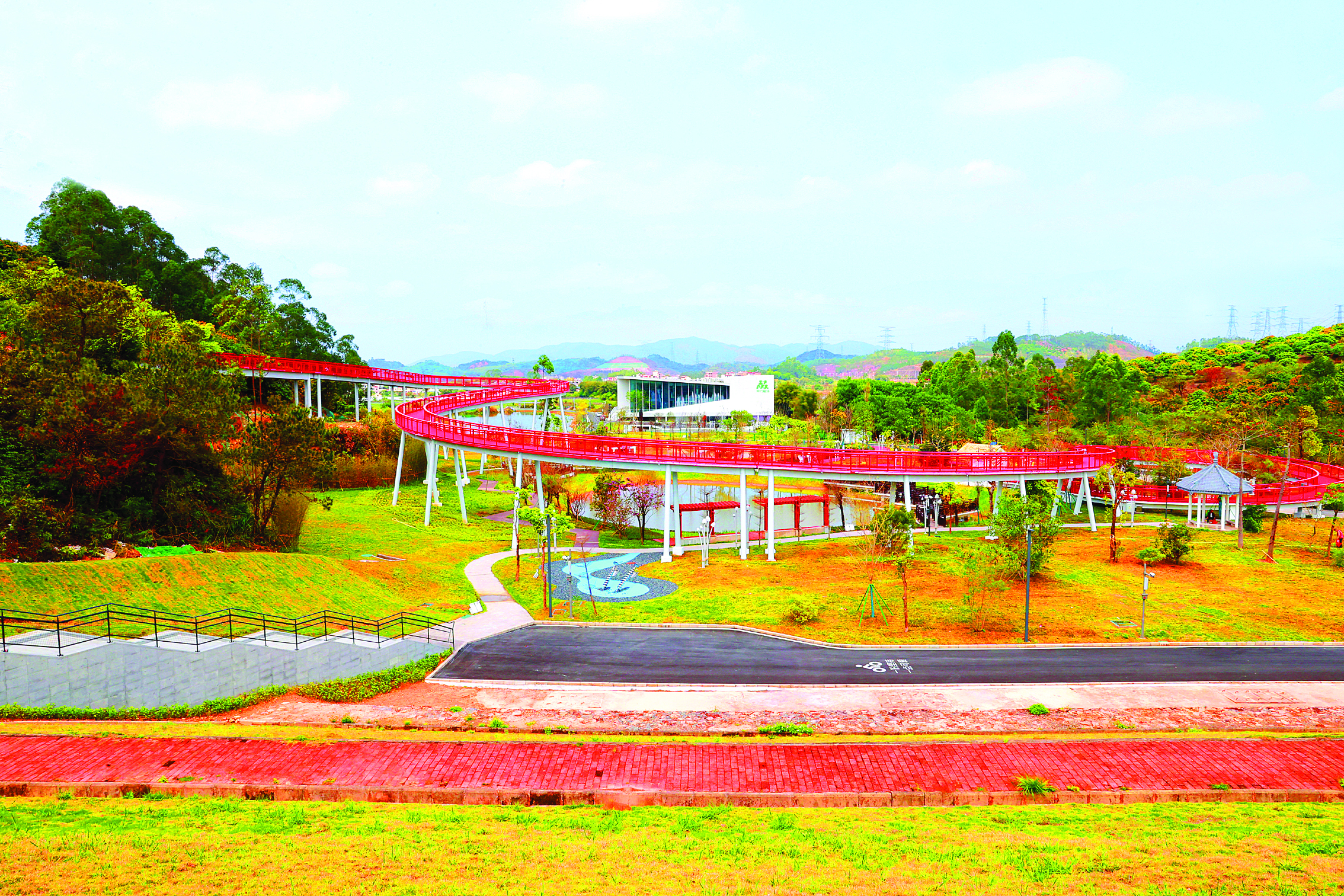 “仲力磁場”以觀洞湖森林公園為圓心,通過綠道、紅絲帶廊橋等物理連接,將散落在鄉(xiāng)野間的山脈、水系、農田與仲愷的工業(yè)園區(qū)有機縫合,深度串聯(lián)潼湖鎮(zhèn)花果山等區(qū)域內的多個行政村與自然村落。