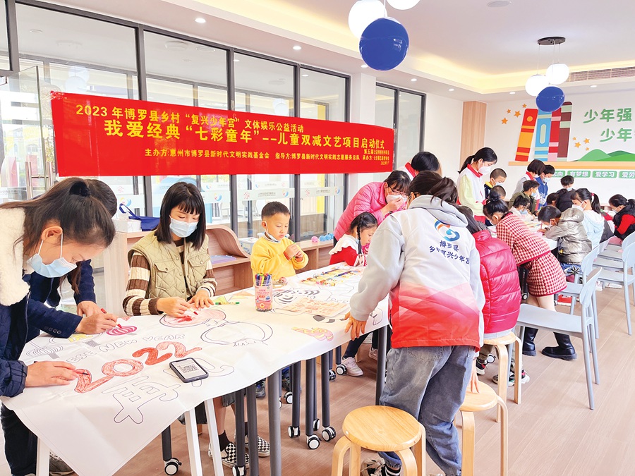 龍華鎮(zhèn)鄉(xiāng)村“復(fù)興少年宮”建設(shè)是博羅縣鄉(xiāng)村“復(fù)興少年宮”建設(shè)的縮影。博羅縣是全國首批50個鄉(xiāng)村“復(fù)興少年宮”建設(shè)試點縣(區(qū))之一,充分依托全縣新時代文明實踐中心(所、站)、學(xué)校原有鄉(xiāng)村少年宮以及公共教育和文化服務(wù)陣地,按照“示范建設(shè)一批、校外融入一批、校內(nèi)提升一批、資源整合一批”的思路,成體系打造滿足農(nóng)村群眾和家庭對未成年子女培養(yǎng)需求的身邊樂園。在活動開展中,堅持把培育和踐行社會主義核心價值觀作為根本任務(wù),緊貼鄉(xiāng)村群眾和家庭對教育培養(yǎng)未成年子女的現(xiàn)實需要,突出道德培育、文體娛樂和勞動實踐三個重點,精心設(shè)計“接地氣、冒熱氣、聚人氣”的特色活動,讓孩子們在活動實踐中益心啟智、健碩身心、茁壯成長。
