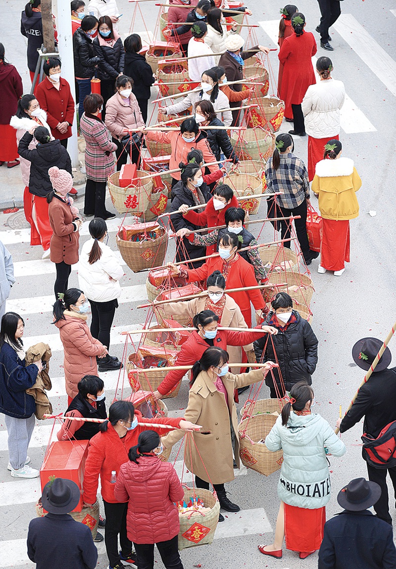 記者在現(xiàn)場看到,當(dāng)天,當(dāng)年添丁的媳婦挑著籮筐跟隨在隊伍中去上燈,婆婆和妯娌也加入到了其中,裝有物品的籮筐有些重,婆婆、妯娌為媳婦分擔(dān)一路的勞累,相互接力,互換著挑起籮筐,也接力挑起了家庭的擔(dān)子,體現(xiàn)出濃濃的婆媳、妯娌和睦持家的情義。沿途各姓氏上燈、巡游的隊伍在街頭相逢,還會相互問候祝福。