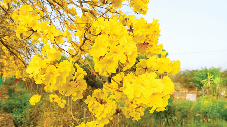 黃花風(fēng)鈴木成為楊僑特色景觀,吸引眾多游客前來觀賞留影。
