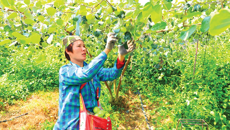 在崗南村的青棗種植園內(nèi)同樣一片綠意盎然。青棗的清香處處彌漫,一個(gè)個(gè)雞蛋大小的青棗綴滿枝頭。果園負(fù)責(zé)人駱令與工人們正穿行其間,采摘成熟青棗。駱令說(shuō):“4年前,我在崗南村租了24畝土地種植青棗。這里出產(chǎn)的青棗個(gè)大、味甜!鼻鄺椃N植園落戶以來(lái),為村民們?cè)黾恿艘粭l增收渠道。