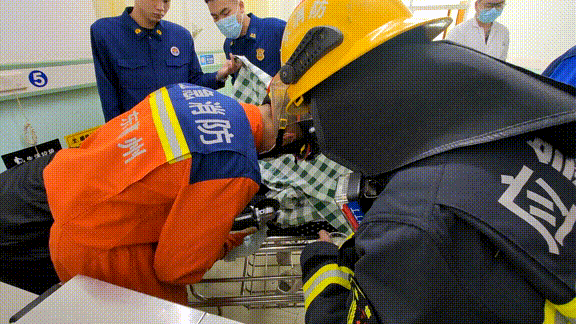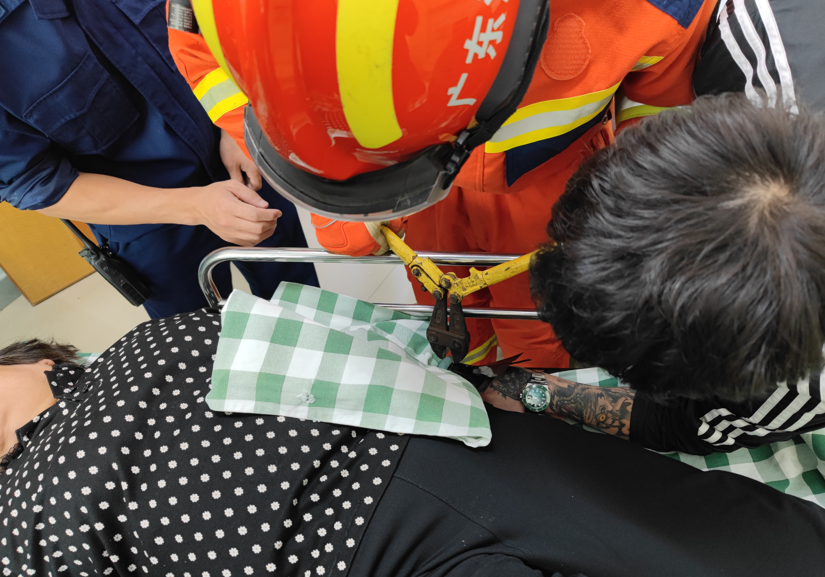 現(xiàn)場消防員發(fā)現(xiàn)老人手腕處骨折導致腫脹,手鐲卡住無法脫出,情況十分危急。