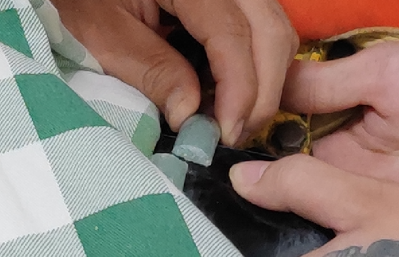 消防員對老人的手腕做好安全保護措施后,先利用切割機對手鐲進行剪割出一個小口,同時,在一旁的指戰(zhàn)員與老人進行談話,轉(zhuǎn)移老人的注意力以緩解其緊張情緒。隨后,消防員將手鐲固定并利用鐵錘沿切割口位置敲碎,成功將手鐲取下。