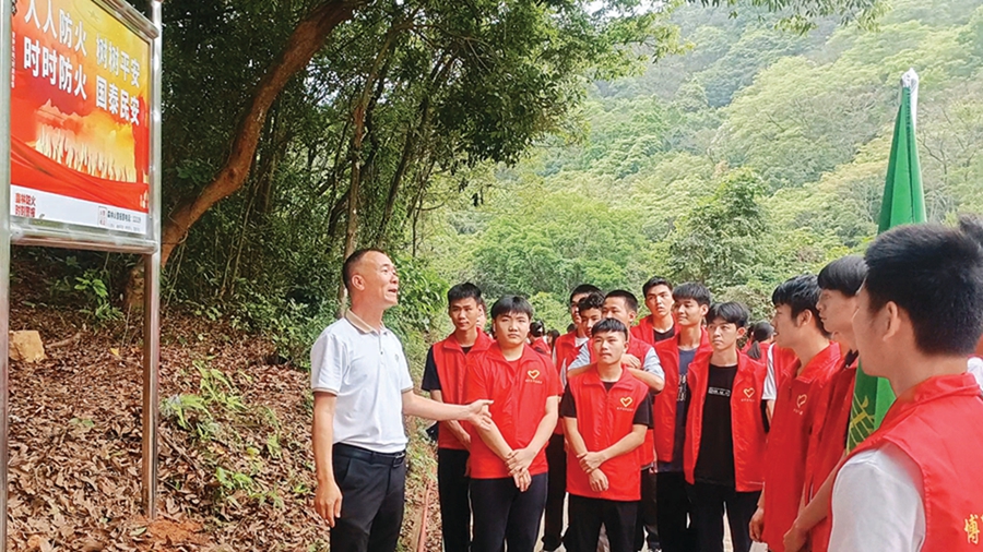 “同學們,這是木荷,是天然的‘防火樹’,可作為林間的防火帶。”在博羅縣科技林長曾建雄的帶領下,志愿者們沿著登山步道,邊走邊學,了解植物生長特性、藥用價值,學習巡林護林知識。