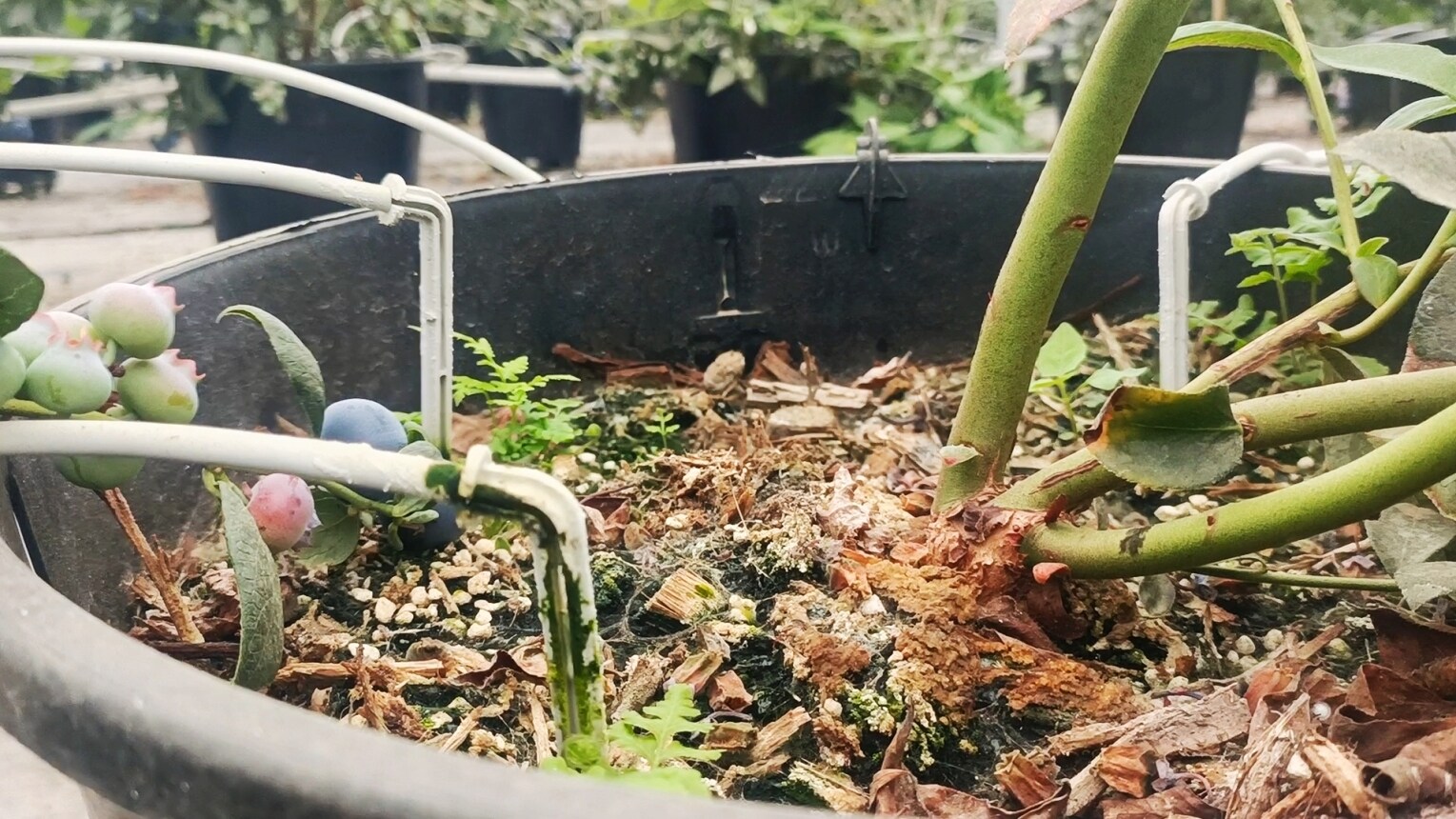 每棵藍莓的盆內(nèi)安裝有滴箭,分別連接著貫穿大棚的管道。