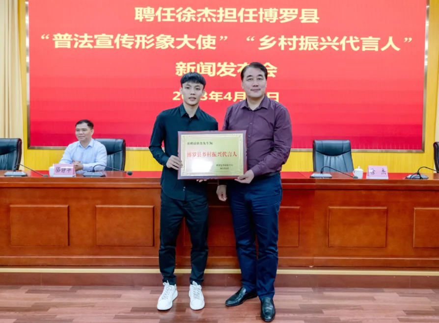 徐杰受聘擔任博羅縣“普法宣傳形象大使”“鄉(xiāng)村振興代言人”。 惠州日報記者盧泓宇 攝