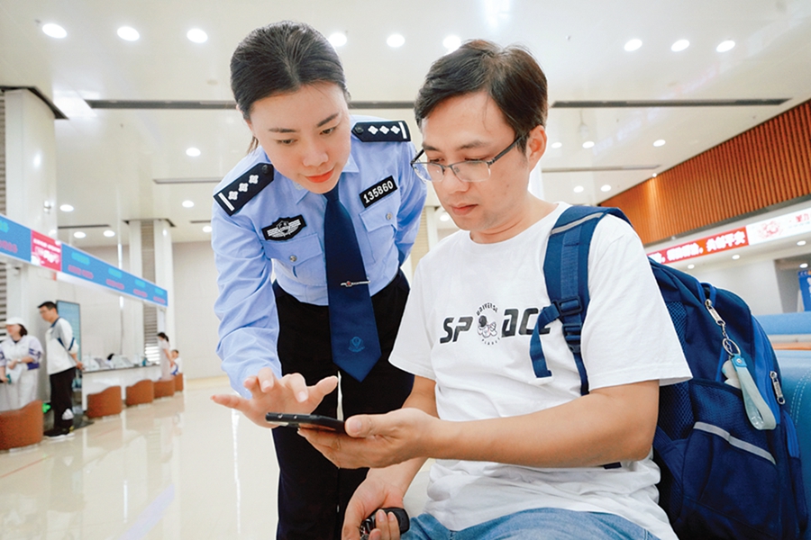 林婷婷(左)指導(dǎo)市民用手機(jī)辦理業(yè)務(wù)。