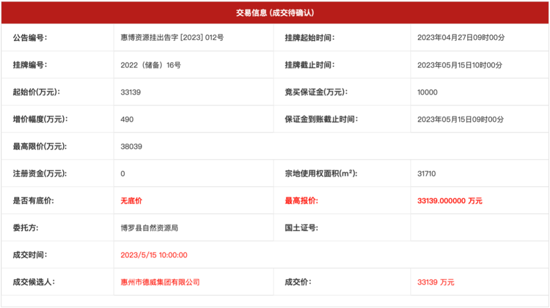 根據(jù)交易公告信息顯示,此次成交的博羅石灣2022(儲備)16號地塊,宗地使用權(quán)面積31710㎡,計容積率建筑面積69762㎡【其中商業(yè)建筑面積占比≤3%,社區(qū)公共服務(wù)用房建筑面積≥600㎡(含養(yǎng)老設(shè)施服務(wù)用房,按每百戶不低于20㎡且套內(nèi)不小于100㎡)】,容積率≤2.2,建筑層數(shù)≤26層,建筑高度<80米,綠地率≥35%。該地塊所建商品住房單套毛坯住房銷售價不高于14000元/㎡,競得人須按《關(guān)于印發(fā)<惠州市自然資源局 惠州市教育局關(guān)于惠州市住宅項目配套教育設(shè)施建設(shè)管理辦法(試行)>的通知》(惠市自然資函〔2021〕326號)文件精神,捐贈997.1724萬元用于教育設(shè)施建設(shè)。競得人應(yīng)在辦理地塊規(guī)劃報建手續(xù)前完善捐贈手續(xù)。此外,競得人開發(fā)投資總額不少于55000萬元(不含地價溢價部分)。