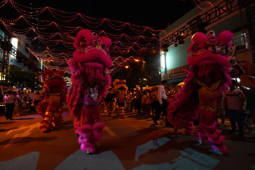 當(dāng)天,晚上八時許,鑼鼓喧天的龍華大鼓表演拉開了商業(yè)街揭牌亮燈儀式的序幕。隨后,6頭醒獅以威嚴(yán)、勇猛之勢舞入商業(yè)街,吸引眾多市民跟隨其后,拍照記錄。抬頭仰望,炫彩的燈光秀以璀璨光影扮靚了商業(yè)街的夜空。在商業(yè)街中央,還設(shè)置有民樂表演舞臺,動人的旋律與悠揚的歌聲,贏得往來群眾的陣陣掌聲。當(dāng)天正值六一兒童節(jié),記者在現(xiàn)場看到,不少市民攜帶孩子到商業(yè)街中拍照打卡,感受熱鬧的氛圍,記錄美好的瞬間。