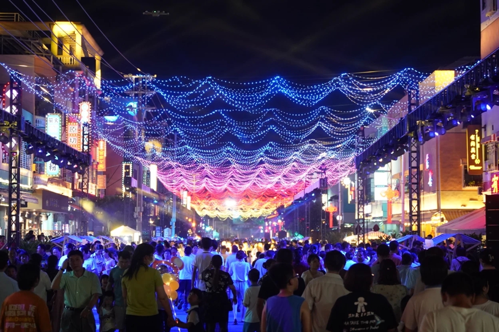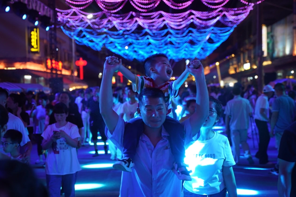 市民攜家?guī)Э谠谏虡I(yè)街欣賞燈光秀。