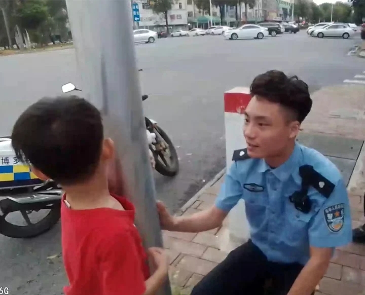 警員耐心詢問小孩相關(guān)信息。