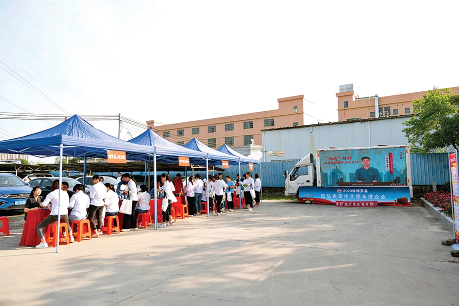 根據(jù)企業(yè)需求,博羅法院定制并派出“服務(wù)單”。今年5月是民法典宣傳月,期間這一做法收到良好效果。用大篷車“典”亮依法營商路,是博羅法院與司法、檢察以及環(huán)保部門聯(lián)合推出的企業(yè)普法專項(xiàng)之一。此次普法專項(xiàng)抓住企業(yè)和企業(yè)員工的關(guān)注點(diǎn),通過法治宣傳“大篷車”+現(xiàn)場(chǎng)法律服務(wù)的方式開展:“大篷車”循環(huán)播放相關(guān)視頻,現(xiàn)場(chǎng)設(shè)置法律咨詢臺(tái)、擺放主題展板,供企業(yè)員工“流動(dòng)式”、自助式參觀學(xué)習(xí);法院干警為企業(yè)員工宣講企業(yè)經(jīng)營活動(dòng)常用法律知識(shí),解答涉企或涉職工切身利益法律咨詢,以高效、便捷、暖心的司法服務(wù)護(hù)航企業(yè)發(fā)展。