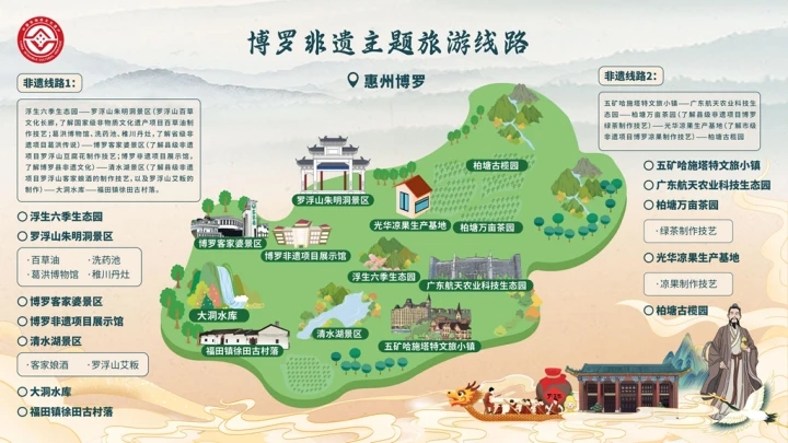 博羅首批非遺主題旅游線路串聯(lián)羅浮山百草油制作技藝、葛洪傳說、博羅涼果制作技藝、羅浮山豆腐花制作技藝、羅浮春酒制作技藝、羅浮山艾糍粑(艾粄)制作技藝、柏塘山茶制作技藝等多項非物質(zhì)文化遺產(chǎn)項目,融入羅浮山風(fēng)景名勝區(qū)、五礦哈施塔特文旅小鎮(zhèn)、浮生六季生態(tài)園等優(yōu)質(zhì)文旅景區(qū),為市民游客提供可看、可賞、可玩、可感知、可體驗的豐富非遺旅游享受。
