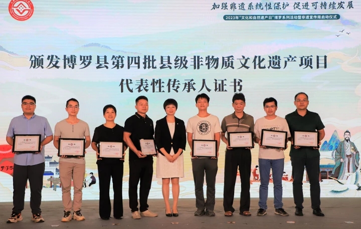 現(xiàn)場還舉行了博羅縣非物質(zhì)文化遺產(chǎn)代表性項目頒牌及傳承人證書頒發(fā)活動,進一步鼓勵和支持博羅縣非物質(zhì)文化遺產(chǎn)項目代表性傳承人開展傳習(xí)活動。葛洪傳說、中醫(yī)傳統(tǒng)制劑方法(羅浮山風(fēng)濕膏藥制作技藝)項目接受廣東省第八批省級非物質(zhì)文化遺產(chǎn)代表性項目牌匾,李曉聰(博羅涼果制作技藝)等16人接受博羅縣第四批非物質(zhì)文化遺產(chǎn)項目代表性傳承人證書。