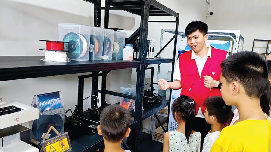 博羅縣點(diǎn)亮創(chuàng)客志愿者服務(wù)隊(duì)隊(duì)長(zhǎng)黃睿國(guó)在向青少年兒童講解3D打印機(jī)。