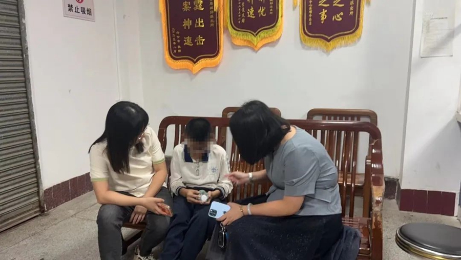 民警將小劉安全帶回派出所并通知家長和校方,學(xué)校校長、班主任第一時間聞訊趕來,小劉媽媽見到小劉的那一刻,聲淚俱下,連連向警察和學(xué)校領(lǐng)導(dǎo)致謝,將自己的孩子安全送回身邊。