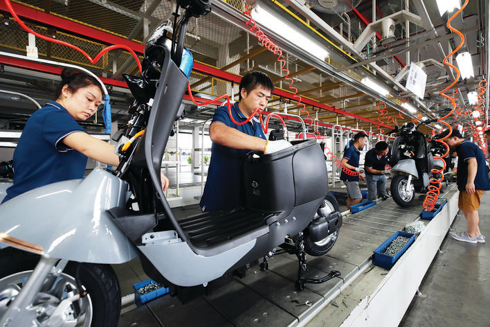 在龍華小刀電動車生產(chǎn)車間內(nèi),整個生產(chǎn)線繁忙有序;葜萑請笥浾哏姇承 攝