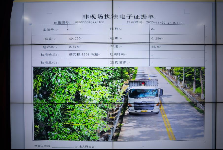 治超非現(xiàn)場(chǎng)執(zhí)法項(xiàng)目搭建了動(dòng)態(tài)監(jiān)測(cè)、稱重、信息發(fā)布等系統(tǒng),自動(dòng)檢測(cè)通過的貨運(yùn)車輛,生成非現(xiàn)場(chǎng)執(zhí)法單據(jù),并推送至終端大屏。