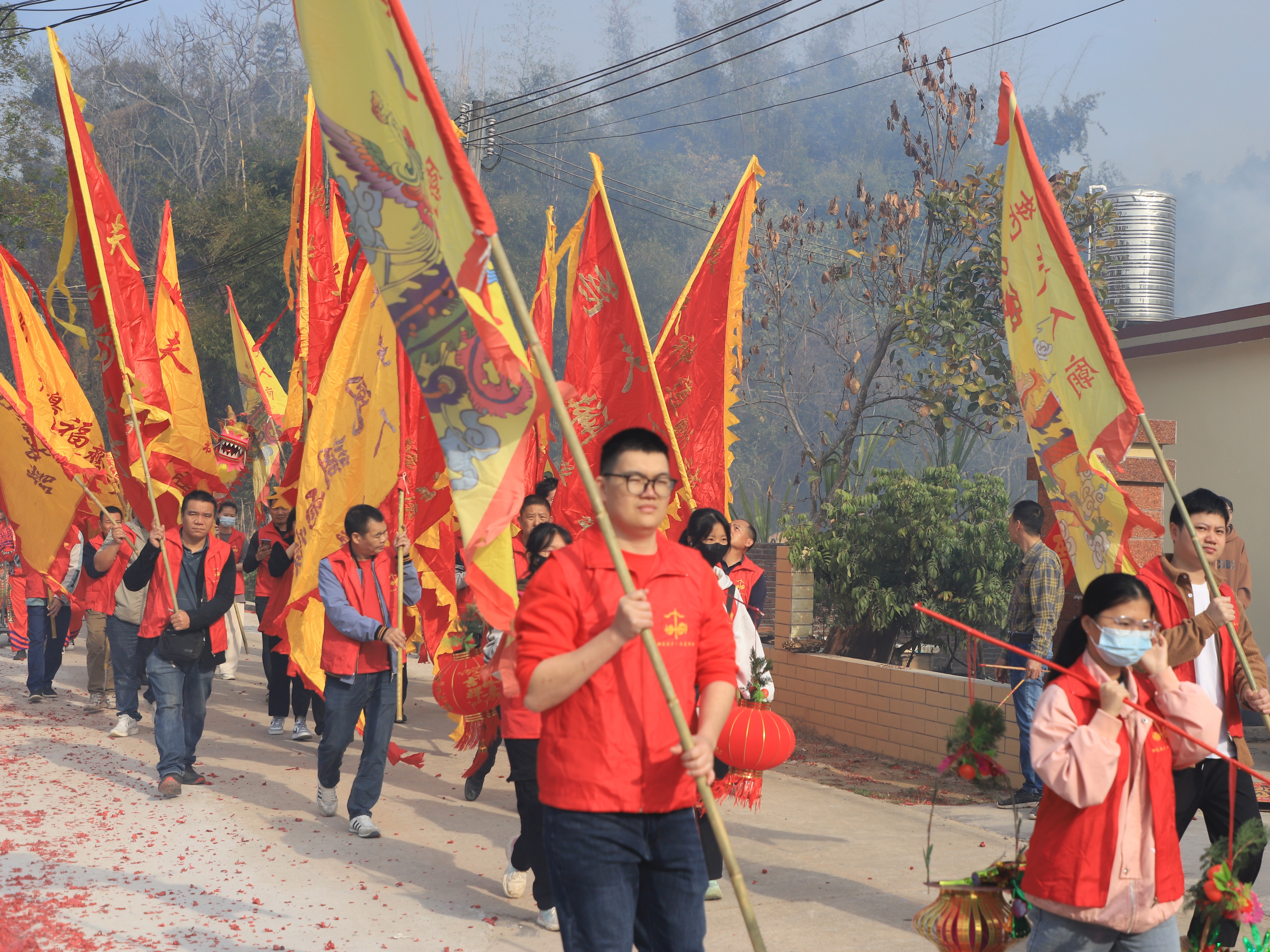 早上9時(shí),巡游正式開始。姚夫人的大黃旗先行,緊接著是拉橫幅的隊(duì)伍,之后便是姚夫人的花轎;ㄞI后面是舉旗的、抬花的、舞龍的、女子醒獅隊(duì)……巡游隊(duì)伍由行宮隊(duì)、錦旗隊(duì)、醒獅隊(duì)、禮炮隊(duì)、鼓樂隊(duì)及民眾自發(fā)加入的隊(duì)伍組成,由姚夫人廟出發(fā),繞村行走,祈求平安健康、風(fēng)調(diào)雨順、國(guó)泰民安。