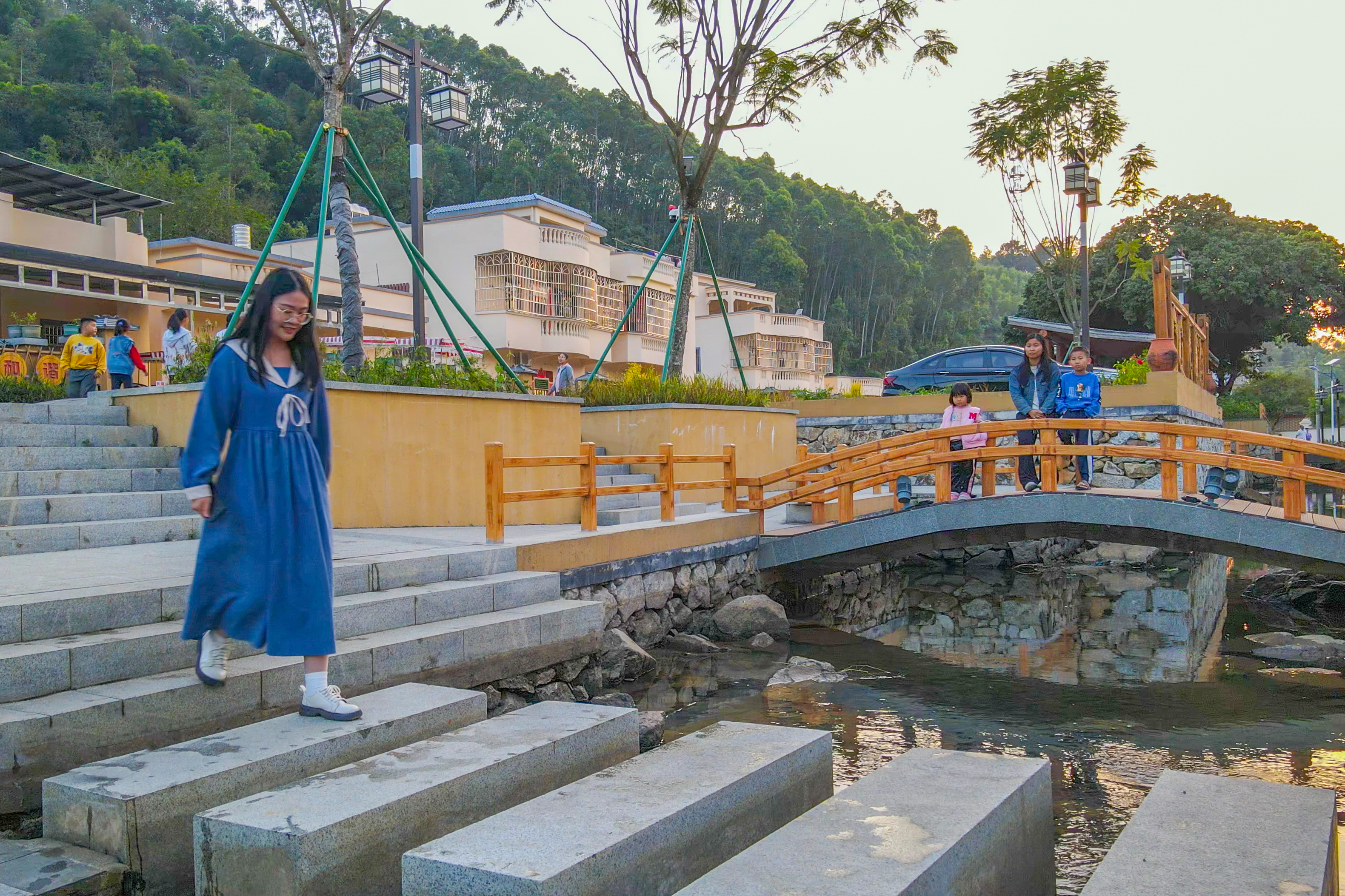 沿著瀝青村道前行,不一會就來到了楊村坑節(jié)點。寬敞明亮的民居一字排開,古樸的文化欄桿展現(xiàn)著文明新風(fēng)尚,清澈見底的溪水靜靜流淌,亭臺、長廊等相映成趣……該節(jié)點圍繞縛婁文化、古村民居、護(hù)城河等概念設(shè)計打造,讓人們切身體會夢幻的縛婁文化,體驗文人雅士的野趣田園生活。