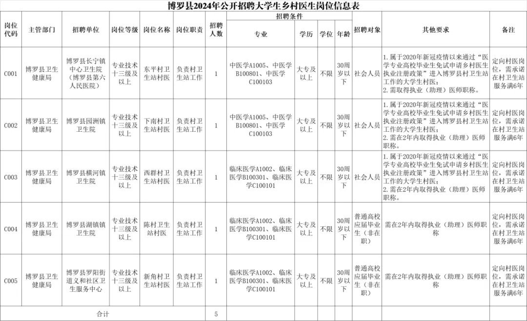 為解決我縣鄉(xiāng)村醫(yī)生緊缺的問題,改善我縣鄉(xiāng)村醫(yī)生人才隊伍結(jié)構(gòu),提高醫(yī)務(wù)工作者整體素質(zhì),根據(jù)《廣東省事業(yè)單位公開招聘人員辦法》(粵府令第301號)《廣東省衛(wèi)生健康委辦公室關(guān)于加快推進(jìn)大學(xué)生鄉(xiāng)村醫(yī)生專項編制保障和公開招聘工作的通知(粵衛(wèi)辦基層函〔2024〕7號)》精神,貫徹落實“鎮(zhèn)招村用”有關(guān)要求,經(jīng)博羅縣衛(wèi)生健康局黨組研究決定,會同縣醫(yī)共體總院面向社會公開招聘大學(xué)生鄉(xiāng)村醫(yī)生共5名。具體公告如下: