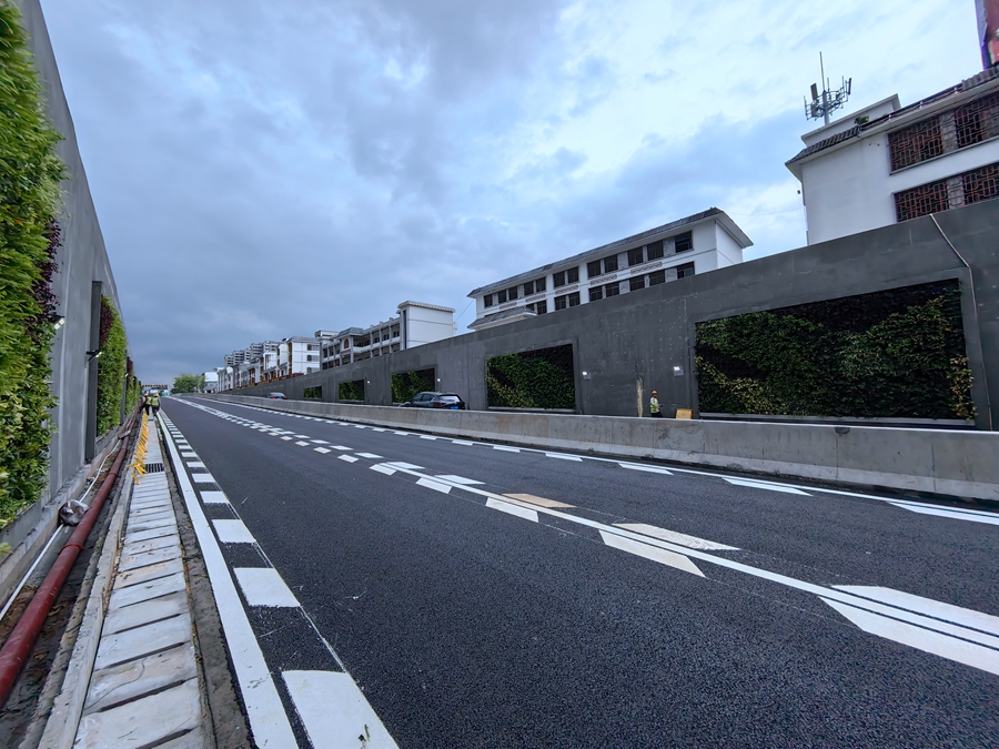 當(dāng)天上午10時(shí)許,記者駕車到該處現(xiàn)場(chǎng)體驗(yàn)。從廣惠高速羅浮山出口下來后進(jìn)入羅浮大道,很快就來到324國(guó)道與羅浮大道交叉口,雙向來往車輛通過隧道快速通行。在下沉通道內(nèi),路面鋪設(shè)了瀝青,交通標(biāo)線清晰。令人眼前一亮的是,通道的墻體上還安裝了多塊立體綠化,種植了鴨腳木、吊蘭等植物,看上去十分美觀養(yǎng)眼。