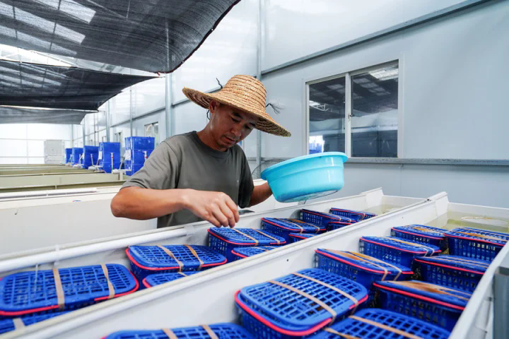 種蝦養(yǎng)殖廠房內(nèi),飼養(yǎng)員正往小籃子里投喂養(yǎng)料。