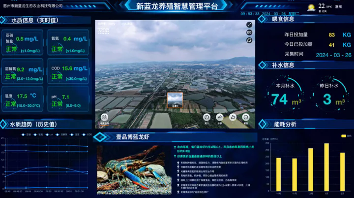新藍(lán)龍養(yǎng)殖智慧管理平臺采用衛(wèi)星數(shù)字航拍、水質(zhì)檢測感應(yīng)等數(shù)字化科技管理系統(tǒng)對藍(lán)龍蝦養(yǎng)殖實行24小時全程監(jiān)控,可對水質(zhì)、水溫實行監(jiān)控,并根據(jù)數(shù)據(jù)警報提醒養(yǎng)殖戶隨時做好投料、補(bǔ)水等一系列工作,實現(xiàn)養(yǎng)殖工業(yè)化、科學(xué)化。