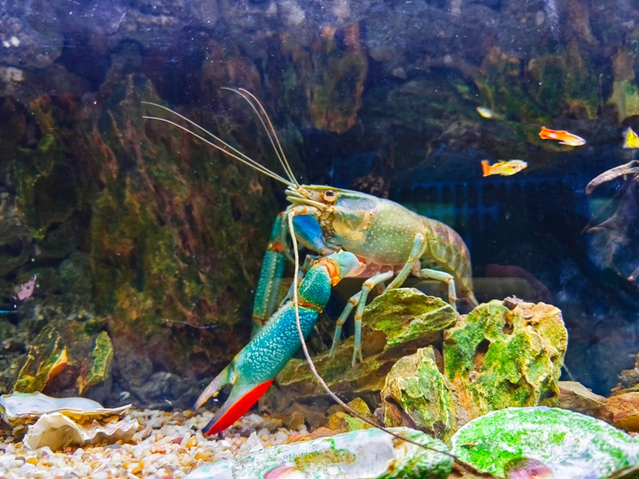 蝦鉗帶點紅,蝦鉗臂有著淡藍色,蝦體色褐綠。在惠州市新藍龍生態(tài)農(nóng)業(yè)科技有限公司的養(yǎng)殖基地,記者一睹淡水藍龍蝦真容。與平常所見的養(yǎng)蝦場不同的是,這里的廠房采用流動水源進行循環(huán),藍龍蝦在標準化的池子里生活。每個池子都擺放著一些“小房子”,供藍龍蝦歇息、躲藏。廠房內(nèi)溫度適宜,光線柔和,亮度適中,正是藍龍蝦喜歡的環(huán)境。藍龍蝦躲在自己的“小房子”里,有的探出腦袋,有的俏皮地游出來又游回去。