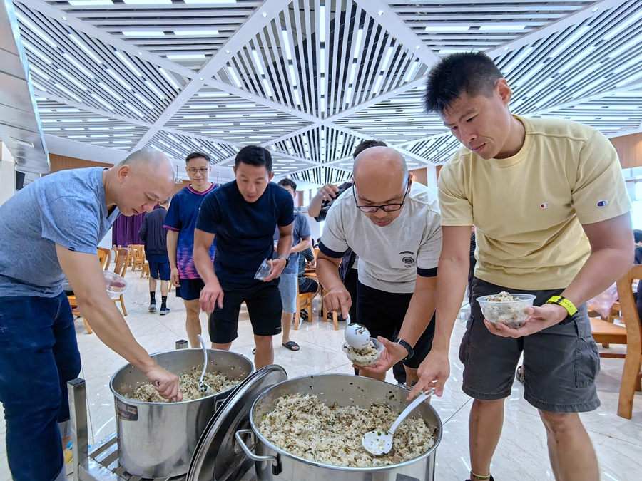 “臘肉丁、糯米、鵝肉、竹筍、冬菇……”在寮仔村的禮堂里,一鍋色香味俱全的“龍船飯”讓粵港同胞大快朵頤!霸贊采弦稽c(diǎn)醬油,就能為這碗‘龍船飯’注入靈魂!卞甲写宕逦瘯(huì)副主任李柏烽說(shuō),吃龍船飯是每年“龍舟季”的必備節(jié)目,不僅有風(fēng)調(diào)雨順、五谷豐登等良好寓意,更彰顯了當(dāng)?shù)厝罕妼?duì)扒龍舟習(xí)俗的熱情。