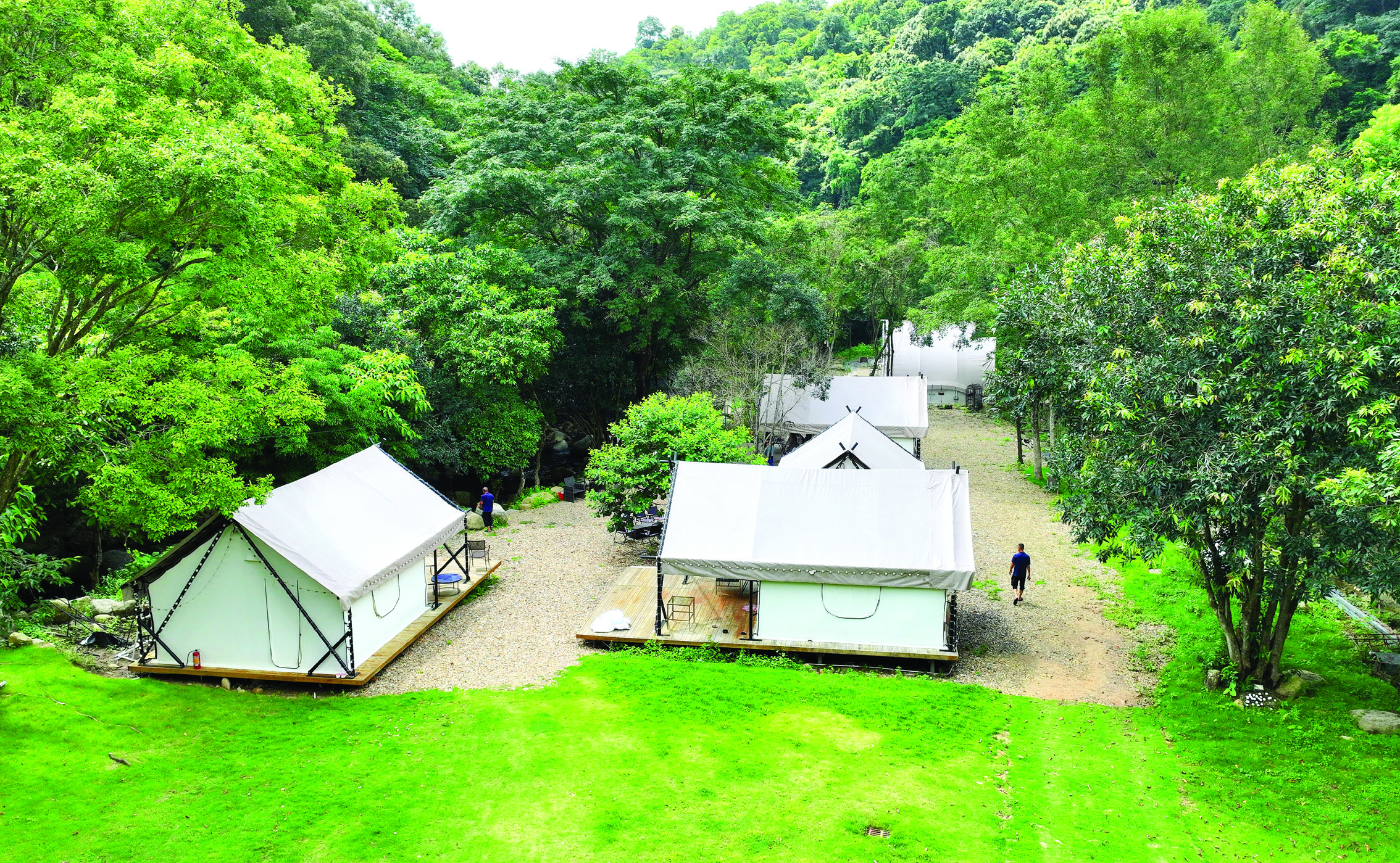 近日,記者來到位于博羅縣長寧鎮(zhèn)酥醪村的“雲(yún)山覓境”民宿,只見群山吐翠,萬木蔥蘢,山野溪澗帳篷,小溪潺潺。白天,游客們或在溯溪戲水,享受清涼,或在草地上圍爐煮茶,暫別城市的喧囂,享受休閑的淡泊寧靜;有的游客沿著溪谷徒步路線穿越林間山地,親近自然,呼吸山林里的清新空氣。到了晚上,游客們天為羅帳地為氈,滿天星斗伴入眠,靜享戶外露營的精致浪漫。