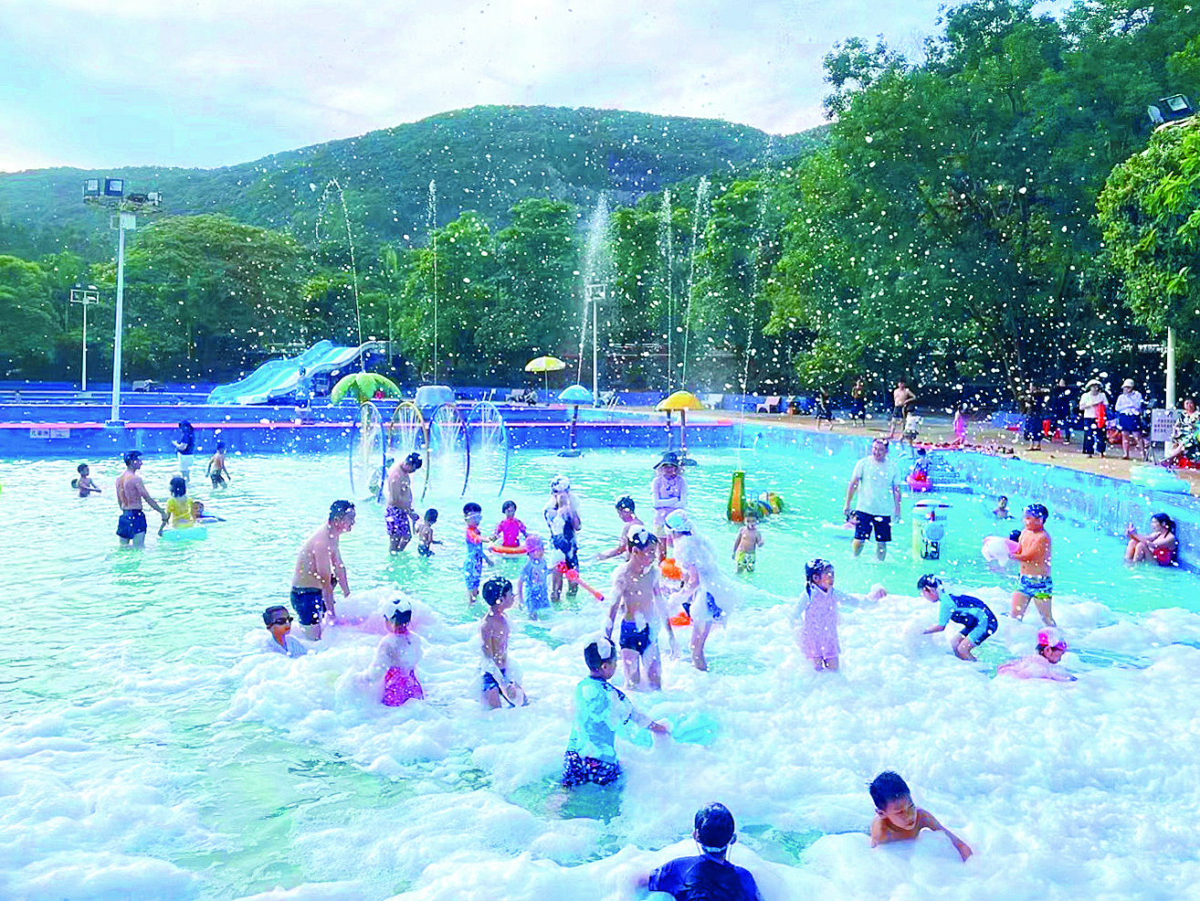 游客們在營地泳池里盡情嬉戲。