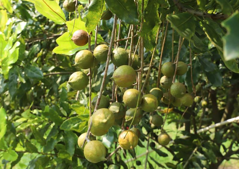 夏威夷果樹屬于喬木,這片果樹現(xiàn)已有兩三米高,樹葉呈長圓形,帶有針刺。夏威夷果樹3月開花,經(jīng)過半年的養(yǎng)分蓄積,進(jìn)入9月后孕育出豐碩的果實(shí)。成熟的夏威夷果表皮呈深綠色,結(jié)成串垂墜在枝頭,呈現(xiàn)出一片豐收景象。