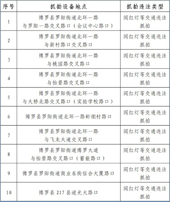 11月8日,惠州交警發(fā)布《關(guān)于公布固定式交通技術(shù)監(jiān)控設(shè)備地點(diǎn)的公告》。博羅羅陽北環(huán)一路沿線交叉路口等路段將新增10套“電子警察”設(shè)備,主要用于闖紅燈等交通違法抓拍,希望過往駕駛?cè)俗⒁庵?jǐn)慎駕駛、安全出行。