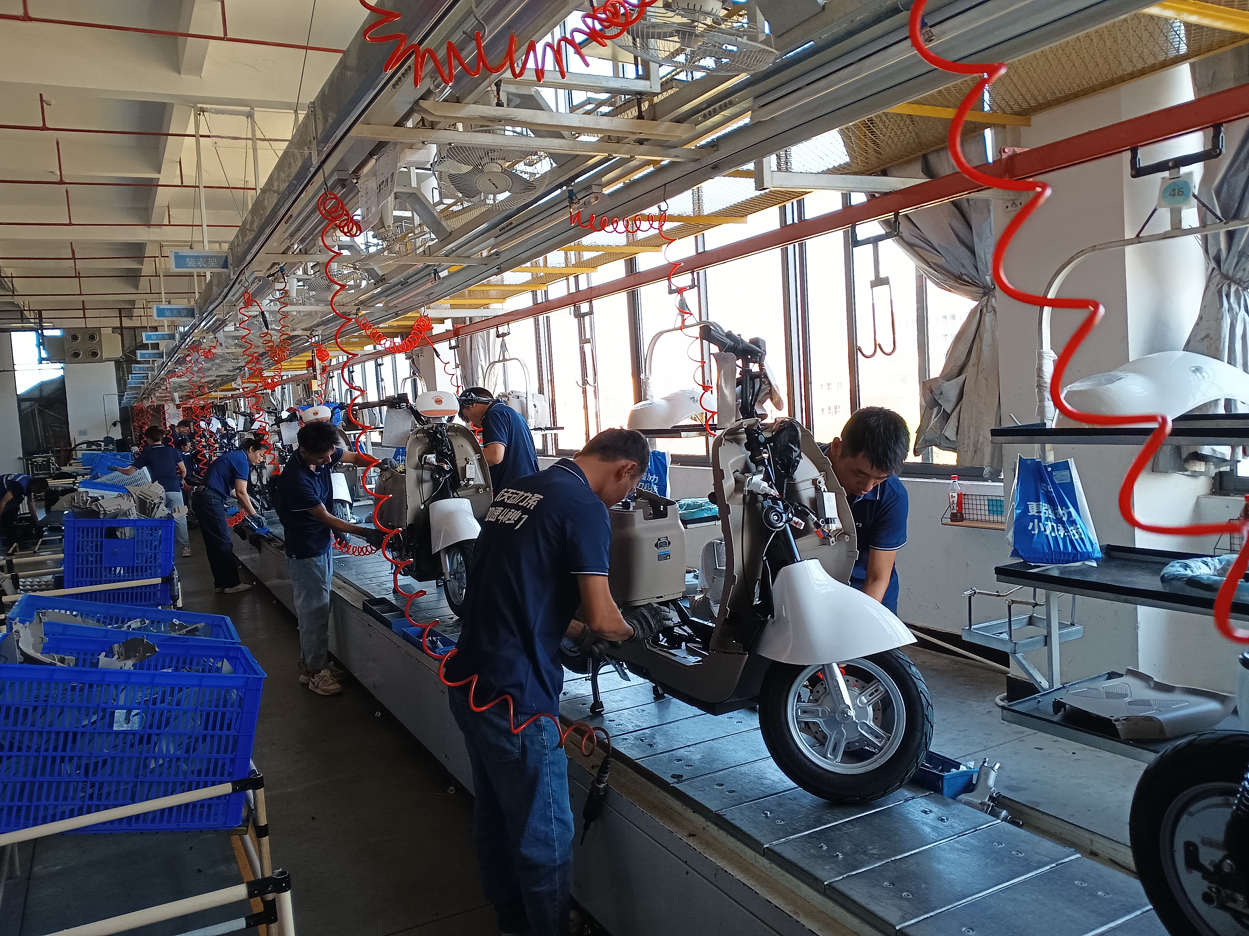 此外,電動車的整車生產(chǎn)還在博羅縣石灣鎮(zhèn)、龍溪街道布局。安裝電機、組裝模具、調(diào)試檢查……位于石灣鎮(zhèn)的新日機電項目于2023年6月投產(chǎn),每天有約1000臺電動車從生產(chǎn)流水線下線。這是石灣鎮(zhèn)首次產(chǎn)出電動車整車。新日電動車項目是江蘇新日電動車股份有限公司在粵港澳大灣區(qū)布局的第一個生產(chǎn)基地。作為新設(shè)立的生產(chǎn)基地,這一項目配備了全自動組合裝胎機、激光打碼機等當前電動車行業(yè)最為先進的生產(chǎn)設(shè)備,用來加碼整車產(chǎn)出。在龍溪街道,2023年4月,博羅縣電動車產(chǎn)業(yè)園路商園區(qū)投產(chǎn)。廣東綠佳車業(yè)有限公司是產(chǎn)業(yè)園內(nèi)生產(chǎn)電動車整車的企業(yè)。而今,該公司的生產(chǎn)線開足馬力,經(jīng)過一道道工序后,一輛輛完整的電動車從生產(chǎn)線下來,準備發(fā)往全國各地。