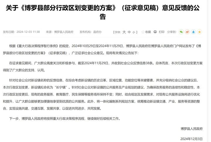 博羅擬將長寧鎮(zhèn)、福田鎮(zhèn)合并為新行政鎮(zhèn),成為環(huán)南昆山—羅浮山縣鎮(zhèn)村高質(zhì)量發(fā)展引領(lǐng)區(qū)啟動建設(shè)以來最受關(guān)注的消息之一。根據(jù)《重大行政決策程序暫行條例》的規(guī)定,2024年10月29日至2024年11月29日,博羅縣人民政府在博羅縣人民政府門戶網(wǎng)站發(fā)布了《博羅縣部分行政區(qū)劃變更的方案》(征求意見稿),廣泛征求社會公眾意見。在征求意見期間,廣大群眾高度關(guān)注和積極參與,截至2024年11月29日,共收到社會公眾反饋信息38條?傮w而言,此次行政區(qū)劃變更方案得到了廣大群眾的支持、認同。