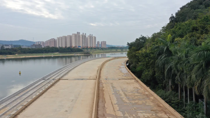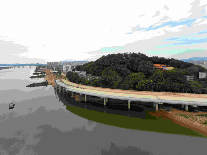 從濱江路與矮崗路交叉口進入濱江西路,葫蘆嶺大橋沿著東江繞行葫蘆嶺貝丘遺址公園往西延伸。項目施工方總工程師賈江坤介紹,葫蘆嶺大橋全長400米,橋梁總寬度30米,設(shè)置為雙向4車道,并設(shè)非機動車道和人行綠道。目前,已經(jīng)完成橋梁主體結(jié)構(gòu)建設(shè),主要余下路面及人行道等附屬工程施工。依水而建,沿江而行。濱江西路工程還將在沿江一側(cè)建設(shè)人行綠道,串聯(lián)起自然山水人文資源和綠色生活空間,建設(shè)成為集自然舒適、生活通勤、健身游憩于一體的休閑景觀大道。