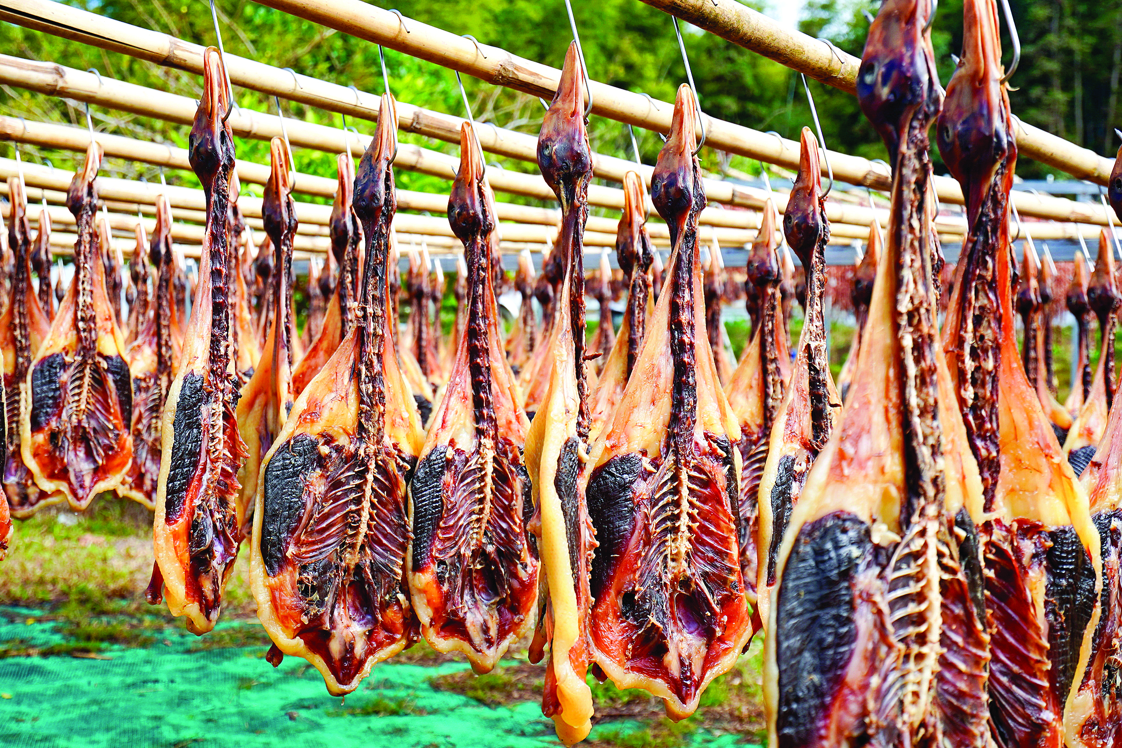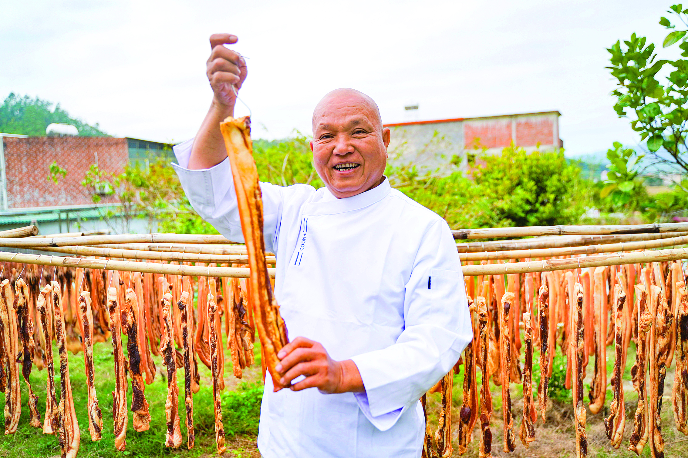 張炎金說,選好食材是制作臘味的第一步,也是關(guān)鍵一步。制作時,盡量保留食材本味,只用姜、鹽、醬油、酒等調(diào)料。這樣,食客在傳統(tǒng)的咸香中可以品味到橫河食材的地道!斑@是橫河臘味的特色,也是游客喜歡橫河臘味的原因!