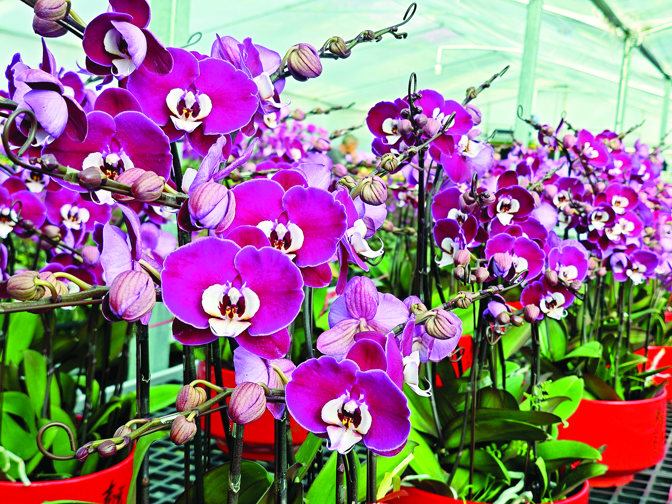 蝴蝶蘭的嬌艷綻放離不開精心培育。楊惠英說,為了讓蝴蝶蘭在春節(jié)前如約綻放,基地提前5個月就開始培育工作。為了給蝴蝶蘭營造最適宜的生長環(huán)境,種植戶們時刻緊盯大棚內(nèi)溫度和濕度變化!霸诜N植蝴蝶蘭這方面,我們的技術團隊有著30多年的種植經(jīng)驗!睏罨萦⒄f,他們會依據(jù)蝴蝶蘭不同生長階段,精確配比肥料濃度與澆水量,并通過調(diào)控溫度、光照時長等,讓蝴蝶蘭在預定時間嬌艷綻放,為產(chǎn)業(yè)規(guī)模的擴大、產(chǎn)品品質(zhì)的提升奠定了堅實基礎。