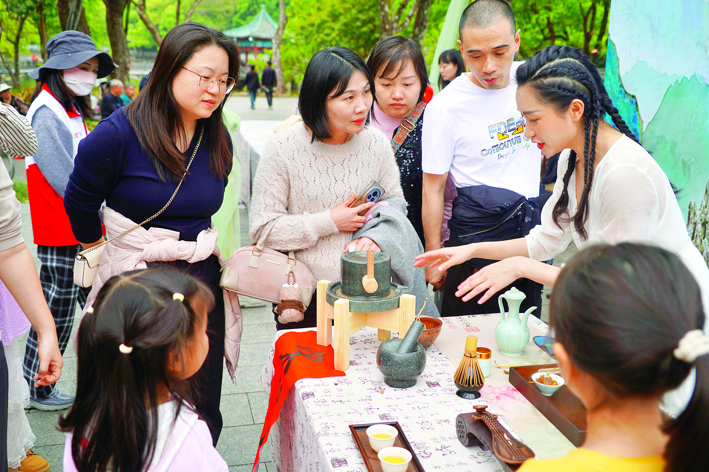 活動現(xiàn)場,非遺技藝沉浸體驗吸引眾多游人駐足。復(fù)原炙茶、調(diào)膏、擊拂等宋式點茶工序,以“湯戲”呈現(xiàn)茶沫作畫的雅趣,讓“色香味形”兼?zhèn)涞牟铚V說茶道的極致美學。從理香到篆香,通過“隔火熏香”技藝展現(xiàn)香韻層次,引導(dǎo)參與者通過嗅覺體悟“靜中觀物”的東方哲學。古箏獨奏《清明雨上》《云水禪心》以五聲音階勾勒水墨意境,同步設(shè)置書法繪畫創(chuàng)作區(qū),游客可現(xiàn)場觀摩或參與創(chuàng)作,形成“視聽觸”多維文化體驗。