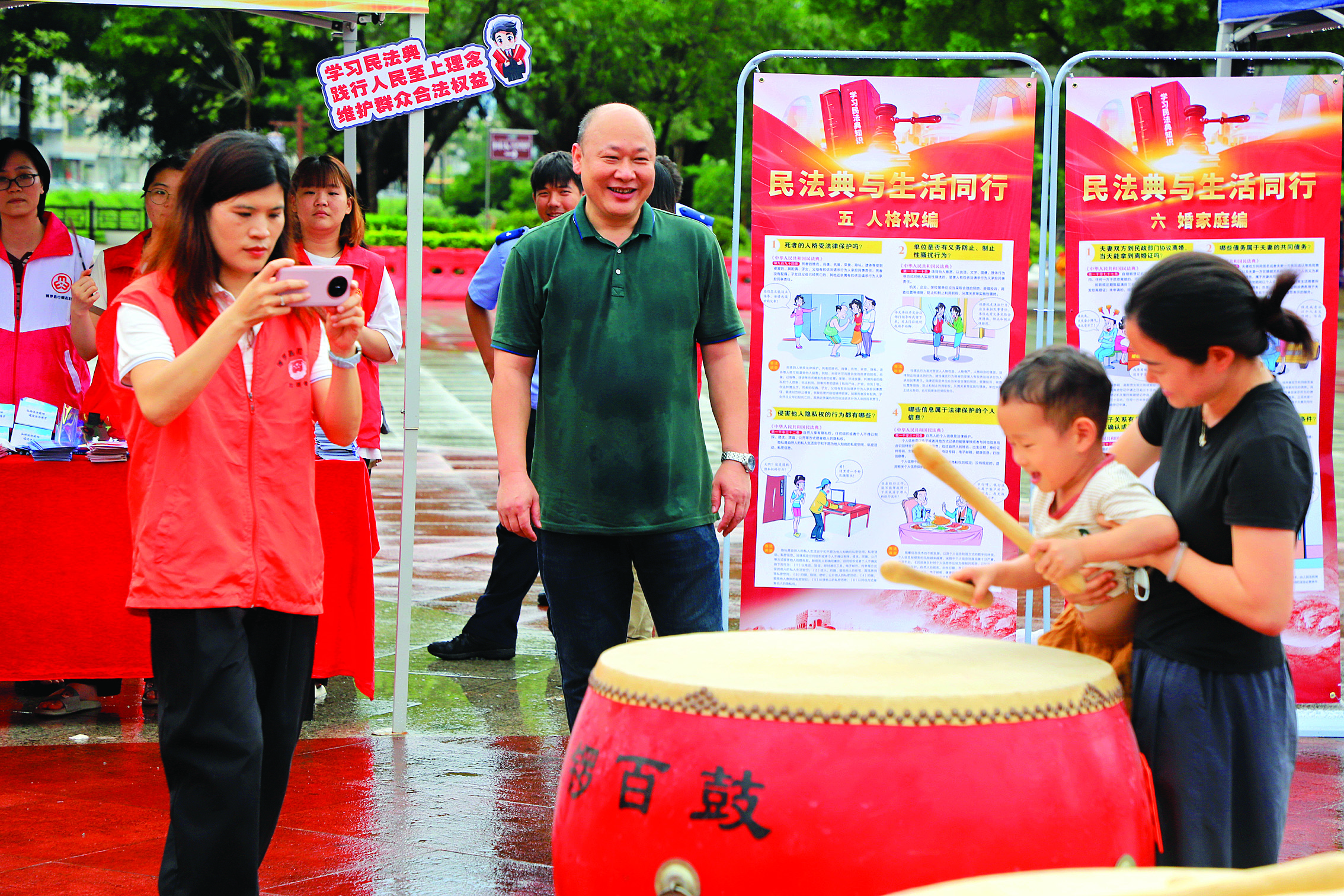 在非遺法韻交響區(qū),除了體驗(yàn)打鼓的樂趣,以“千鑼百鼓”為原型創(chuàng)作的湖鎮(zhèn)IP形象“鼓白白”“鑼芊芊”也在現(xiàn)場亮相,呆萌可愛的公仔點(diǎn)燃了現(xiàn)場人氣,吸引了眾多群眾前來觀賞。此時,湖鎮(zhèn)鎮(zhèn)司法所普法志愿者順勢引導(dǎo)群眾觀看旁邊的民法典宣傳展板,帶領(lǐng)大家認(rèn)真閱讀。展板主題為“民法典與生活同行”,以生動的案例圖解形式,深入淺出地解讀了民法典七大編章的核心內(nèi)容。