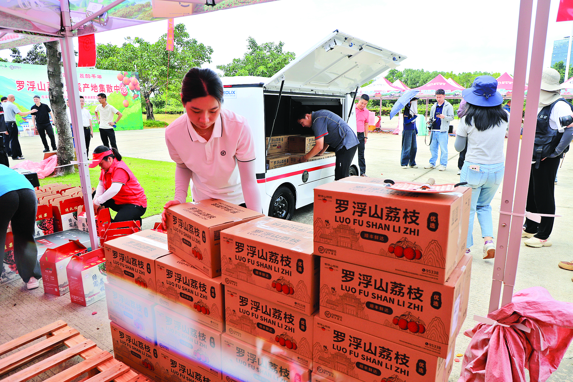 工作人員將荔枝搬上無(wú)人車。 惠州日?qǐng)?bào)記者李燕文 盧泓宇 攝