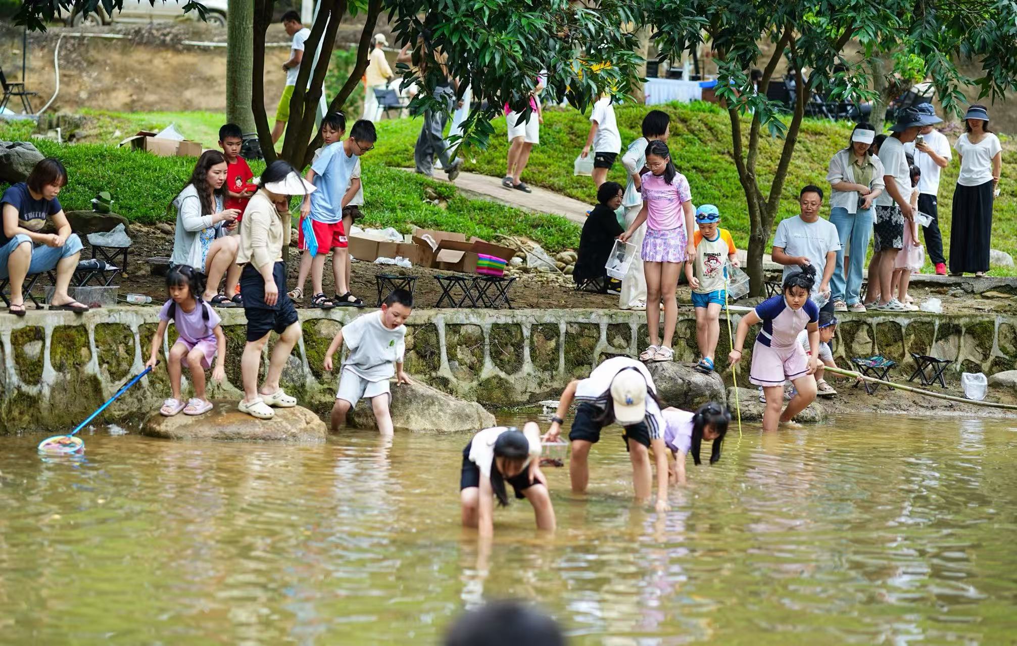 孩子們?cè)诶韫獯寤葜菪囊拜p奢營(yíng)地摸泥鰍。惠州心野輕奢營(yíng)地供圖
