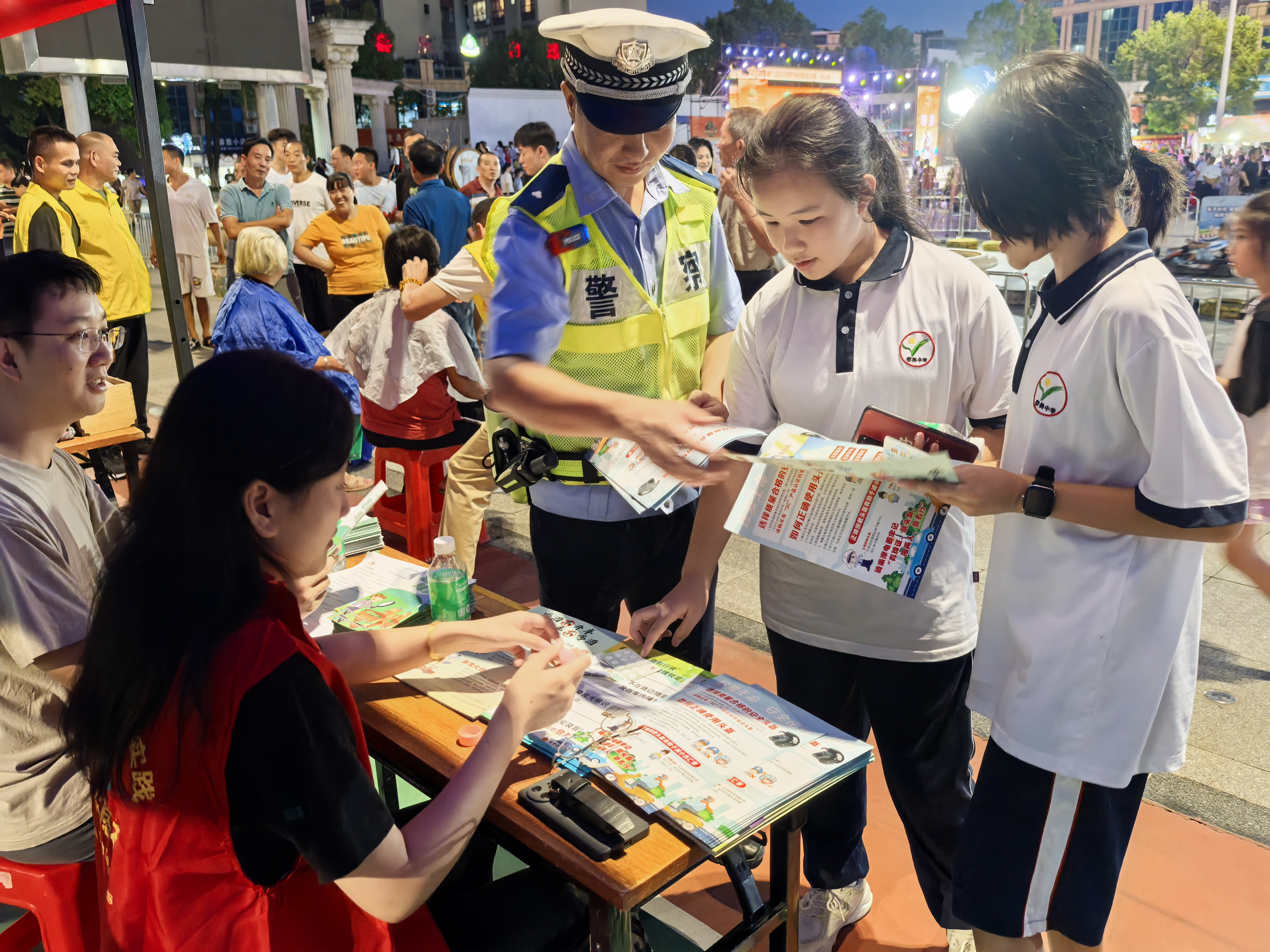 活動當晚,6個主題宣傳攤位整齊排列,應(yīng)急、交通安全、禁毒、工會職工權(quán)益、婦聯(lián)、公共服務(wù)等領(lǐng)域志愿者化身攤主,通過“講解+互動”“案例+問答”的形式,用方言俚語、身邊故事把政策講“活”、道理說“透”。