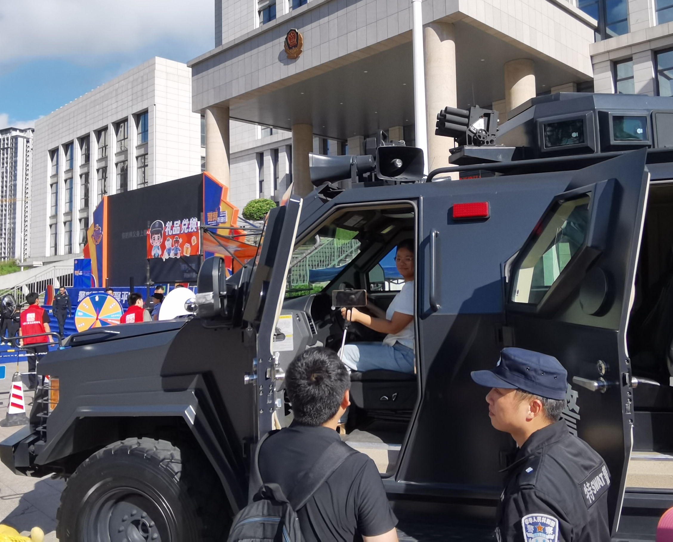 裝備展示區(qū)更成了群眾“零距離”接觸警務(wù)裝備的“科普課堂”。警員們細(xì)致地向群眾講解了盾牌、戰(zhàn)盔、防毒面具、防彈衣等警用裝備的功能及使用規(guī)范;炫酷的警用摩托車、威武的裝甲車等裝備一字排開,成為現(xiàn)場(chǎng)的“網(wǎng)紅打卡點(diǎn)”。小朋友們爭(zhēng)相爬上裝備參觀,眼神里滿是向往,家長(zhǎng)們則舉著手機(jī)記錄精彩瞬間。通過“看得見、摸得著、問得清”的互動(dòng),群眾既認(rèn)識(shí)到警用裝備的嚴(yán)肅性,更真切體會(huì)到警察守護(hù)平安沉甸甸的責(zé)任感。