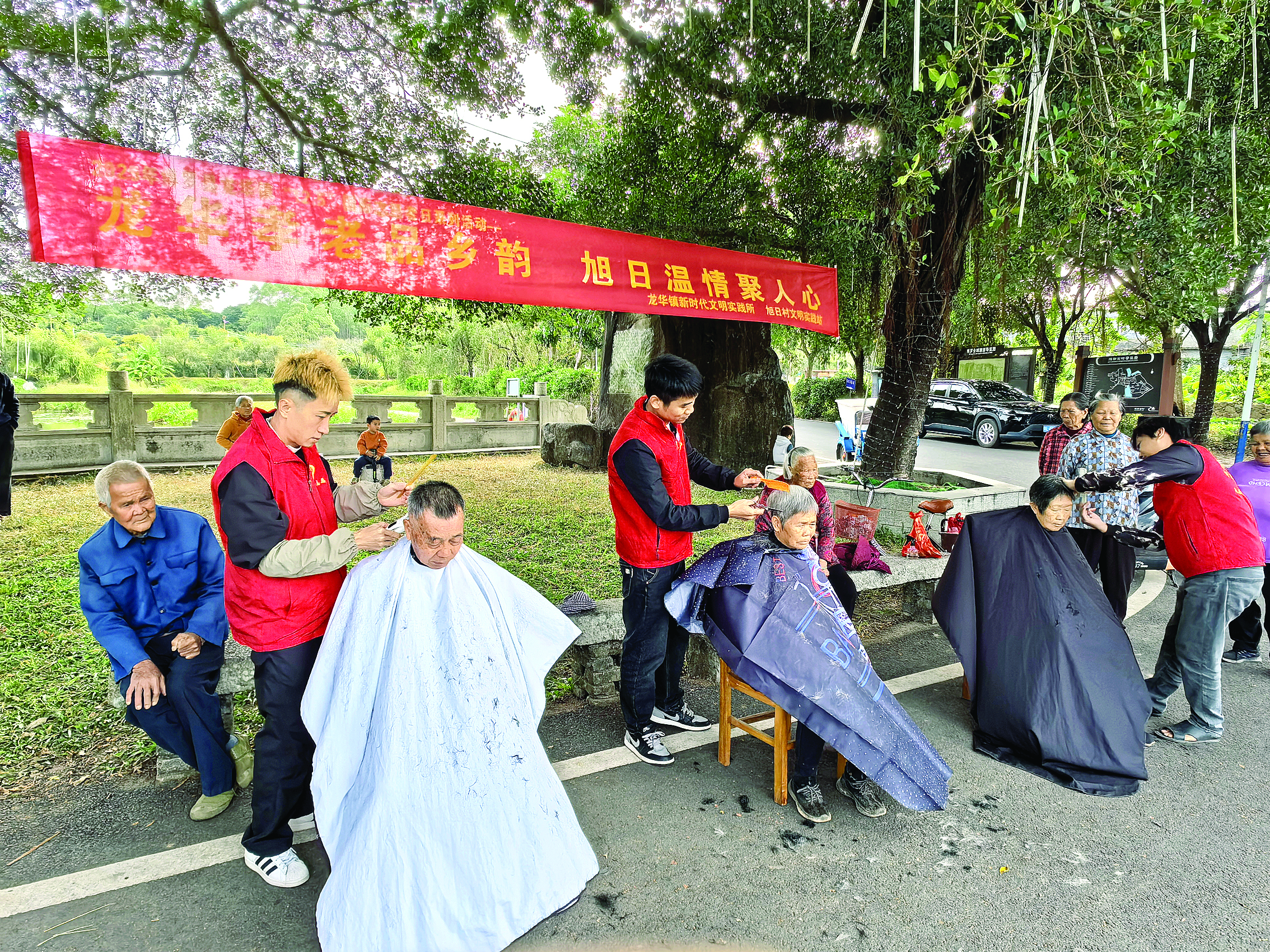 推子輕推,剪刀細(xì)修……大榕樹下,老人坐在凳子上,陳鏡明等人挨個(gè)為他們理發(fā)。他們嫻熟的手藝為老人們剪出清爽的發(fā)型。一年多來(lái),他們累計(jì)義剪300~400人次。