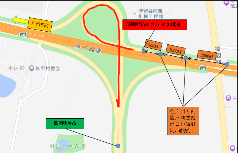 園洲收費(fèi)站廣州方向出口封閉繞行示意圖。
