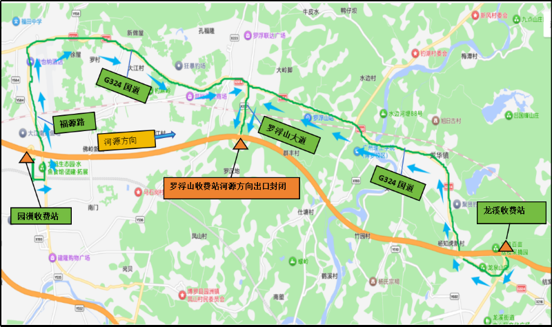 羅浮山收費(fèi)站惠州方向出口封閉繞行示意圖。