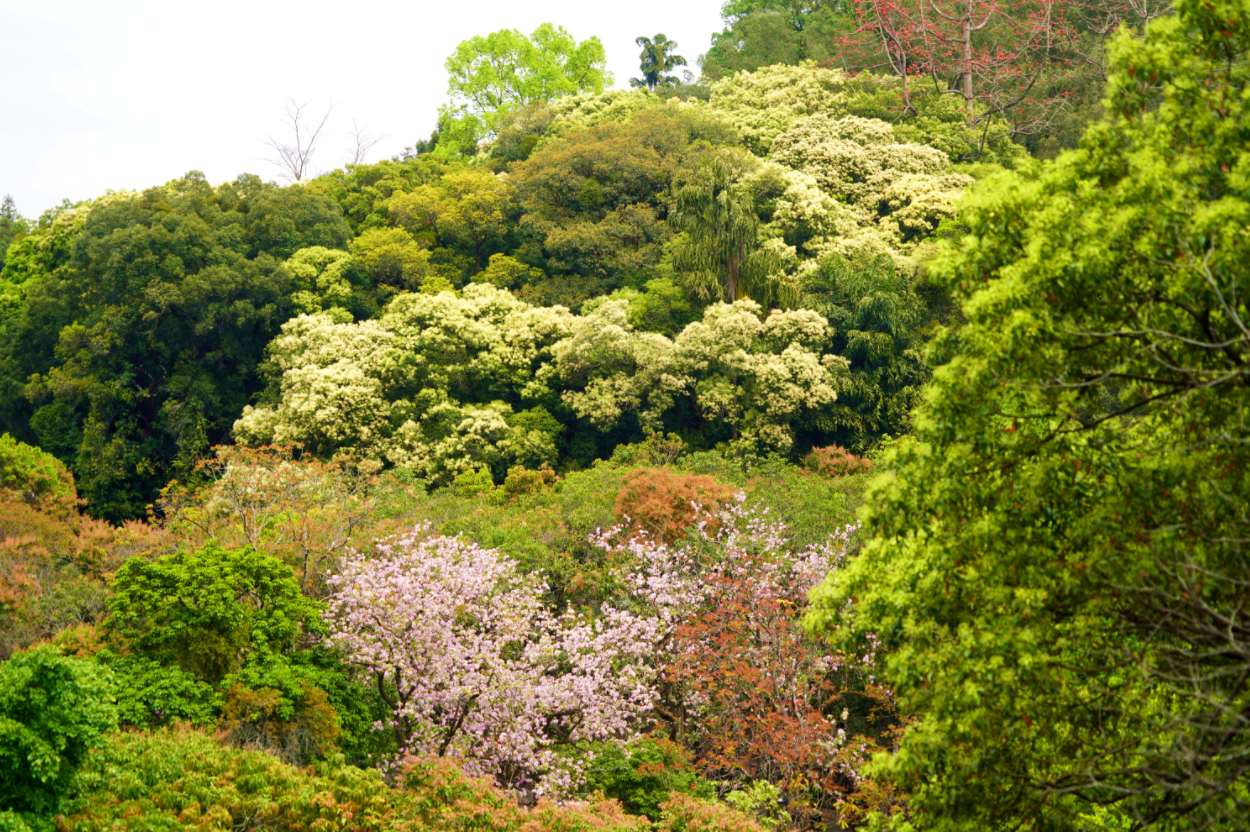 山間原始林木抽芽吐綠,深淺不一的蒼翠鋪滿山巒,造就羅浮山最治愈的天然綠境。