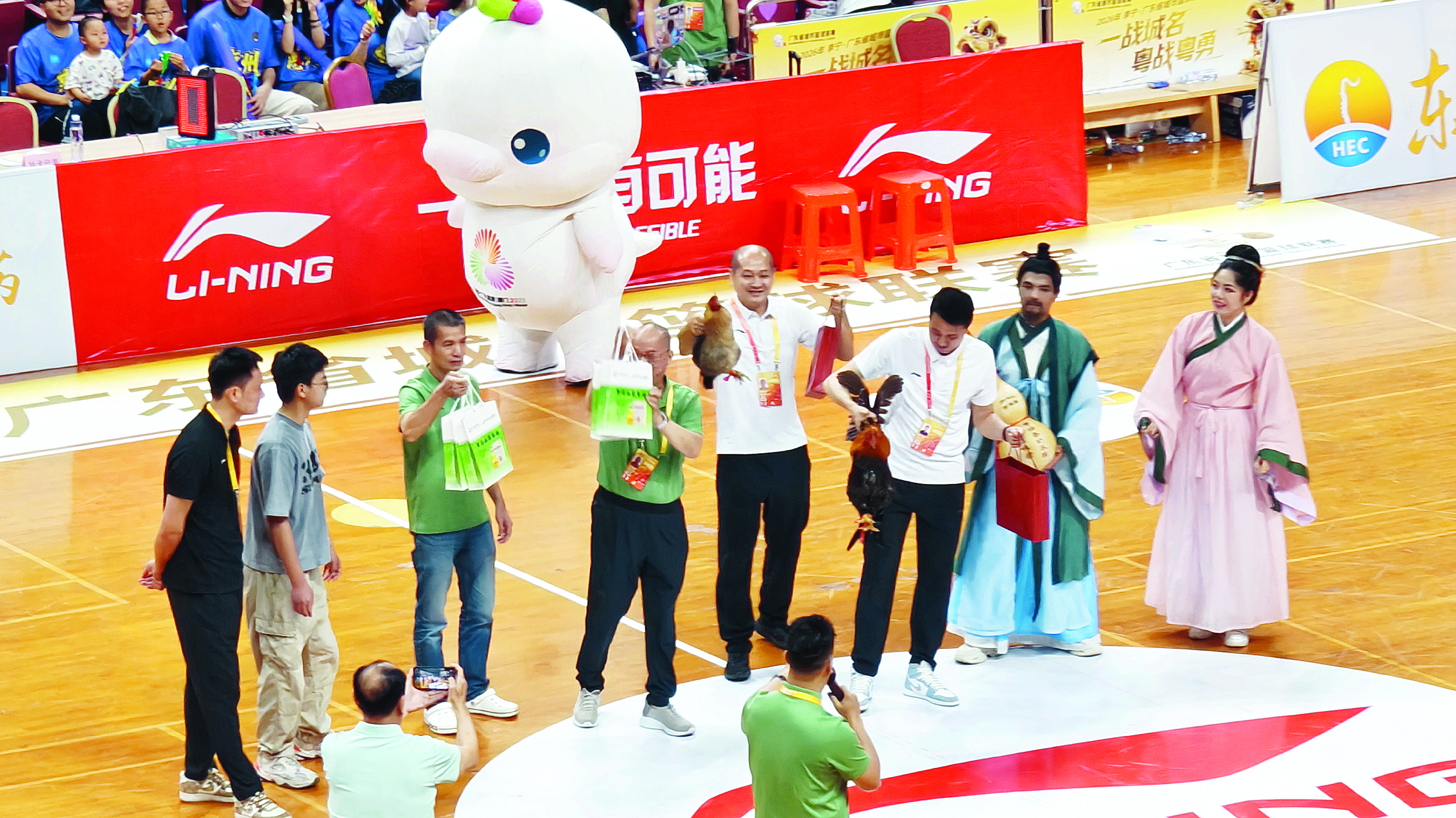中場(chǎng)休息時(shí)段,禮物互換環(huán)節(jié)溫情上演;葜蓐(duì)與清遠(yuǎn)隊(duì)互贈(zèng)特色禮品。其中,惠州隊(duì)向清遠(yuǎn)隊(duì)贈(zèng)送了羅浮山百草油。相傳,羅浮山百草油處方源自于葛洪,取百草之意而命名為“百草油”。葛洪的妻子鮑姑是晉代著名女醫(yī)家,更是中國(guó)古代四大女名醫(yī)之一,她與葛洪并肩在羅浮山行醫(yī)濟(jì)世。禮物互換環(huán)節(jié)中,葛洪與鮑姑的扮演者身著古裝,手捧羅浮山百草油緩緩登場(chǎng),衣袂飄飄間,仿佛從千年之外走來(lái),讓現(xiàn)場(chǎng)觀眾沉浸式感受中醫(yī)藥文化的源遠(yuǎn)流長(zhǎng)與獨(dú)特魅力。如今,羅浮山百草油不僅是博羅文化的鮮活載體,更成為當(dāng)?shù)刂嗅t(yī)藥產(chǎn)業(yè)的一張名片,支撐著嶺南中醫(yī)藥文化的傳承與發(fā)展。